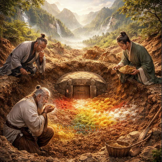- Sự biến đổi địa tầng: Khi đào qua lớp đất mặt (phù thổ) và lớp đất thực (thực thổ), nếu thấy màu sắc đất đột ngột thay đổi sang năm màu rực rỡ hoặc đỏ vàng tươi nhuận, đó là bằng chứng của việc đắc khí.