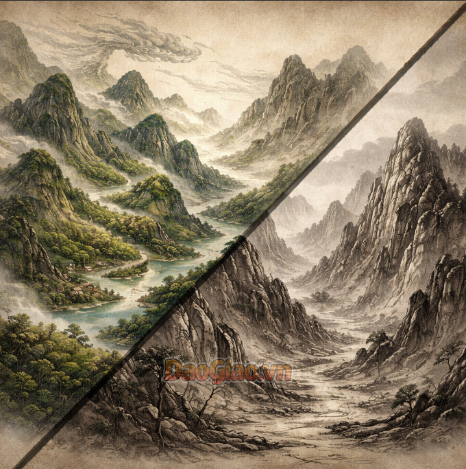 • Mạch núi thường: Thường có dáng vẻ thô xuẩn (thô kệch, nặng nề), cứng đờ, thẳng tuột (ngạnh trực) hoặc bị vỡ vụn, sắc lẹm một cách vô tình. Những mạch núi “chết” này thường khô cằn, không có sự chuyển mình linh hoạt.